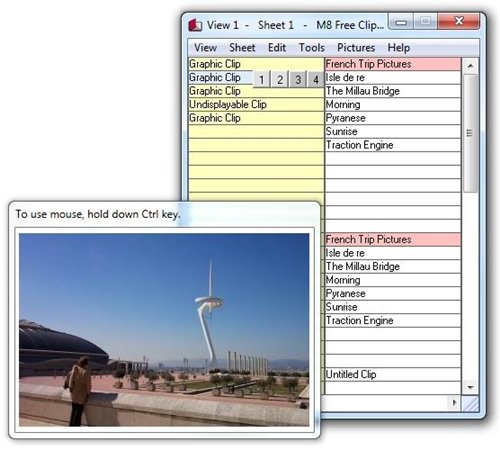 多任务剪贴板(M8 Free Clipboard) 17.19 英文版 M8 Free Clipboard 是一款截屏和剪贴板程序。它是用简单,可以抓取用户在任何程序中的拷贝或者剪切内容。软件最多可以保存30项剪贴内容,用户只需在列表中选择需要粘贴的内容即可。普通截屏功能通过 Prt Scr键实现,截取动态画面,则是Alt+PrtScr键。