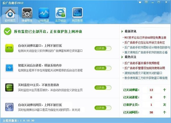 反广告助手是一款针对广告骚扰的永久免费软件,它能够自定义添加规则关闭自己想关闭的弹窗、弹网页、后台进程,还能锁定IE主页防止恶意篡改。而且它占用系统内存小,运行后对日常使用毫无影响,适合最小化隐藏到系统托盘长期开着,实在是居家上网必备好工具!