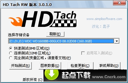 HD Tach(硬盘专用性能测试软件) V3.0.1.0 汉化绿色特别版 HD Tach RW 是一款专门针对磁盘底层性能的测试软件。它主要通过分段复制不同容量的数据到磁盘进行测试,可测试出磁盘的突发数据传输率、CPU 使用率、随机存取时间,连续读取数据传输率及连续写入数据传输率等参数。如硬盘驱动器, 可移动驱动器(ZIP/JAZZ),闪存驱动器, RAID 阵列等设备。