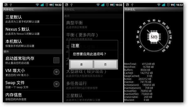 1.优化多任务:当您正在设备上运行大量应用程序时,系统尽会可能地为正在运行的应用程序分配更多的RAM,从而可以运行更多的应用程序,任务切换也更加流畅2.平衡(剩余内存):与“平衡”的效果基本一致,但对于RAM超过512MB的设备效果更好,它可以给您更多的剩余内存,但会略微降低多任务能力