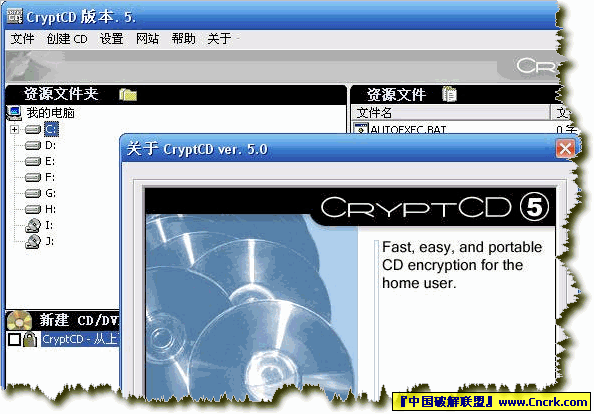 CryptCD 5.0 家庭零售版(修正)(制作自己的加密光盘、硬盘、优盘) CryptCD 可以将数据加密打包成映像,并且可以刻录成加密光盘。只有输入正确的密码才能查看加密内容,否则就算得到光盘也不能查看里面的内容。这样你就可以制作自己的加密光盘了。它还可以定制加密查看器的背景,文字和加密等级,更能通过各种诱骗选项达到掩人耳目的误导效果。不一定要刻成光盘才可以使用,你也可以把生成的加密包放到硬盘、优盘、Zip磁盘甚至软盘里,所以即使你没有刻录机一样可以享受它强大的功能