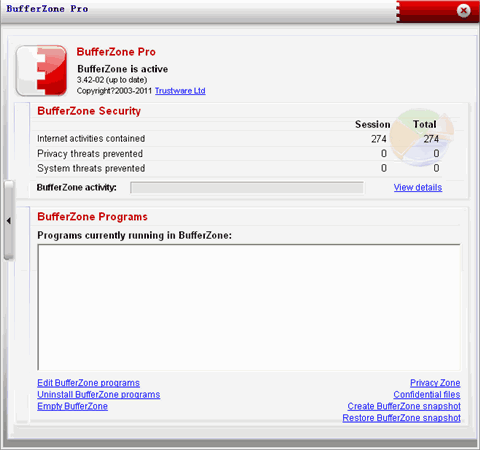 BufferZone跟SandBoxie一样是属于沙盘工具,可以保护你的系统在遭到窜改的时候提供你可以恢復的机会,所利用的原理就是BufferZone会在你的系统上建立一个跟你系统完全一模一样的虚拟系统,你可以把你想要做的修改或者是软体安装在这个虚拟系统上,如果不喜欢或是受到病毒的攻击,受损的也只是虚拟系统而已。只要清空这个沙盘,你的系统就会回到安装或是倍病毒攻击之前的状态,在防护能力上一点也不输给SandBoxie。