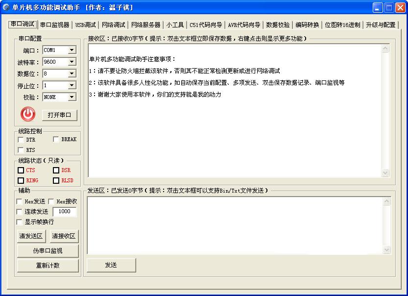 单片机多功能调试助手一款集串口/USB/网络调试、进制转换、字模与数码管字型码制作、常用校验值计算、UNICODE码转换、位图输出C文件等众多功能于一身的综合型调试软件。