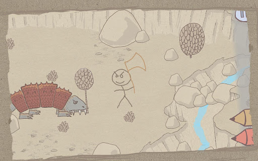 场景六,这关是相当激情的一关,我们学会了画斧头,可以用来砍树,右边是条死路,用火烧开上方的炸药前进。