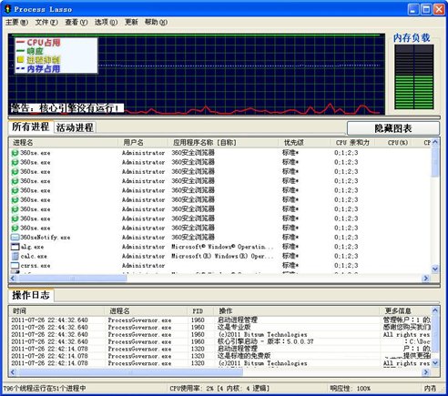 动态调整各个进程的优先级并设为合理的优先级类实现为系统减负,此项特性被 Process Lasso 定义为过载抑制(out-of-control restraint),可有效避免蓝屏、假死、进程停止响应、进程占用 CPU 时间过多等症状。同时它还具备前台进程推进、工作集修整、进程黑名单等附加特性。动态调整各个进程的优先级并设为合理的优先级类实现为系统减负,此项特性被 Process Lasso 定义为过载抑制(out-of-control restraint),可有效避免蓝屏、假死、进程停止响应、进程占用 CPU 时间过多等症状。同时它还具备前台进程推进、工作集修整、进程黑名单等附加特性。【注意事项】