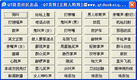 QT音效器主持人特效包括将近50多种音效,超强力的音效辅助工具 该工具非一般音效集合,采用音效压缩,无写出 写入,体积与相等工具小于1~4倍左右 本程序非常适合MC,主持人,聊吧接待,K歌特效,活动 等等