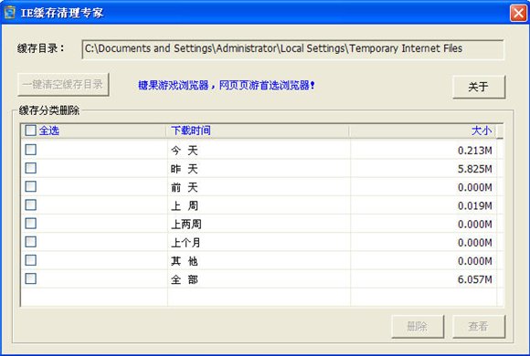 IE缓存清理专家 1.0 绿色版 IE缓存清理专家(IE缓存清理工具)是一款专业的IE缓存清理工具,可以按照时间来排序和清理缓存,并且可以精确查找和删除任何一个缓存文件。特别适用于网页游戏玩家,当游戏缓存加载失败时可选择只清理当天的缓存,从而避免了因为清理掉了所有的缓存而要重新加载游戏。