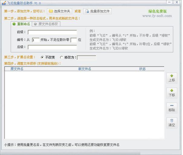飞云批量改名助手是一款最简单易用的文件批量改名工具。支持[批量重新命名]和[批量原文件名修改]两种命名方式,支持原文件名恢复,为用户的意外操作增加一份安全保障。