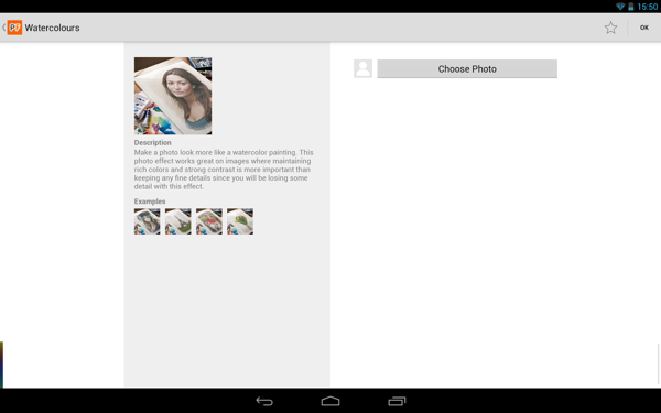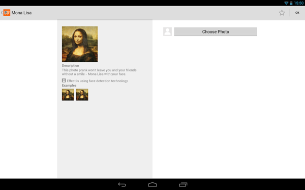 使用非常的简单,打开软件后,选择一张图片模版,软件内置上百张图片模版, 选择自己喜欢的模版,点击choose photo,选择你需要替换的照片, 稍等片刻,一张整合得非常完美的照片就出来了。你可以设置为壁纸,彩信发送,蓝牙共享或者分享到互联网应用,如Picasa,Twitter,facebook,Gmail等各种微博应用,浏览照片支持多点触摸,这样的效果以我的水平自己PS的话估计要花上好几天。不过需要注意的是,上传的照片最好先稍微剪切一下,使脸部在图片中央。不过PhotoFunia的脸部侦测技术十分强大,一般不会有什么问题。