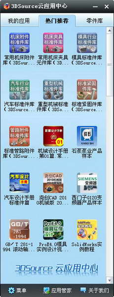3dsource云应用中心是为广大工程师群体打造的应用资源共享服务平台。其采用全新的app模式,云集了海量3d模型、2d图纸、产品样本、设计手册、标准、培训教程、论文、工具软件、hao网址等各式各样的应用资源。