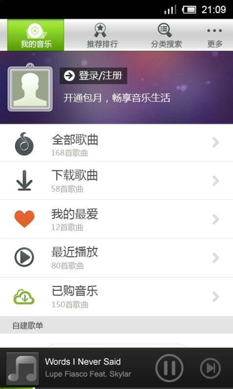 这款京东音乐的界面采用的是全手绘的界面风格,整体看起来非常非常的清新,应该是界面控的最爱。功能上与其他音乐播放软件并无特别之处,主要是多了一个音乐在线购买功能。京东在电子商务方面真是无孔不入啊,连音乐都不放过了。