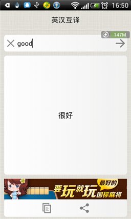 英汉互译词典 V1.2.0 安卓版 英汉互译词典是一款支持中英文相互翻译的软件,本软件支持语音输入,支持模糊匹配单词,并支持发音利于您的学习和使用。软件翻译时采用后台技术,不影响前台界面的使用,界面清新简约非常人性化,欢迎您下载使用,欢迎提出宝贵意见。
