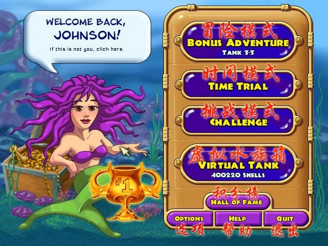 Insaniquarium,相信很多人都玩过在线的吧,这个游戏还有PLAM版本,我第一次玩WEB版的时候,真是玩到第二天手都不能动了,鼠标估计也差不多坏了,从来没有一款游戏让我如此上瘾,很多玩家都是通过这个游戏知道POPCAP的,那年夏天,得到POPCAP的来信,得知即将出豪华版的消息,简直是兴奋了好几天,然后就是一直等啊等啊。天天去POPCAP的网站上看,给POPCAP发了好多E-mail,看能不能得到测试,终于,在8月31号,等到啦。太爽啦。第一时间下下来,然后就是玩,玩到60分钟,备份存档文件,恢复系统,再玩,我已经习惯这样了,要在第一时间内通关嘛。 [5]OK,正式点评一下吧,好玩,实在是好玩,不管是画面上还是音乐上,都有很大的进步,增加了关数、宠物、鱼等,增加了时间模式和挑战模式,还有屏保。这些都大大增加了可玩性。在游戏中,大家每关都是钱够了就过关吗?NO,我喜欢的养整个屏幕的鱼,那才爽呢,然后养成钻石鱼,满屏幕都是金币、钻石,然后再让他们慢慢的挂掉(不要说我BT哦),最后再过关。