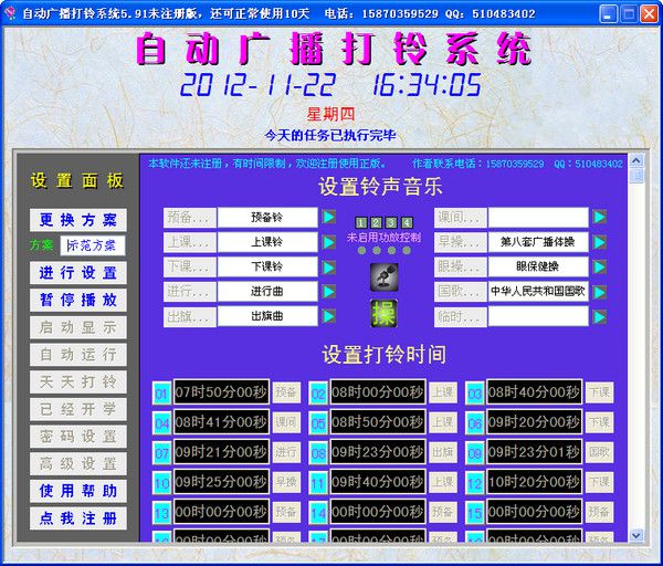 自动广播打铃系统操作界面直观、步骤清晰,可以创建任意多套方案,并可以自动切换,智能语音提示功能使校园充满人性色彩。通过本软件即可以控制电脑电源,只需一个简单廉价的设备便可以用本软件自动控制功放机的电源和实现分区广播。