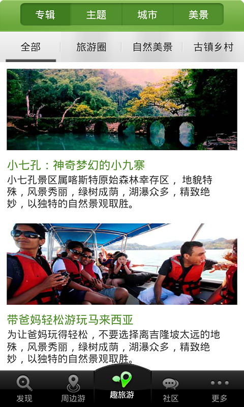 趣旅游-国内首款旅游休闲LBS手机应用,是一款好用的旅游App手机旅行软件,涵盖旅游攻略、城市导游、旅游路线、美食攻略、周边游等实用信息,是您外出行旅游的必备手机旅行应用。 趣旅游——旅行达人必备,在这里,可以通过热点、专辑、周边游、主题游、城市导游,使用百度地图发现户外休闲旅游的好去处;发现好玩的地方,查看特色景点、自助游、自驾游攻略,GPS导航定位您周边好玩的好吃的,还可在景点签到、点评,与最懂玩的人记录分享足迹、路线及照片、GPS导航、新浪微博组件、微博定位等多功能的免费软件。分享旅途中的乐趣。