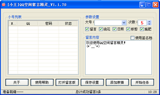 小王QQ空间留言精灵是一款可以帮助用户自动在QQ空间留言软件,该软件支持批量登陆小号刷留言,还可以刷花藤属性,是用户刷QQ空间留言的好助手。