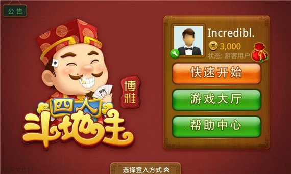 博雅四人斗地主是一款休闲性质的斗地主扑克牌游戏,轻松上手,娱乐性强,游戏划面精美,内容丰富,让你随时随地都能“斗”起来!高品质的宽屏画面,给你带来不同的视觉体验!两副牌,炸弹比三人斗地主更多更刺激!每天登录更有惊喜大礼!四人斗地主最早流行于中国大陆的浙江、江苏和上海,目前已经发展为全国地区最流行的四人扑克游戏之一【游戏特色】