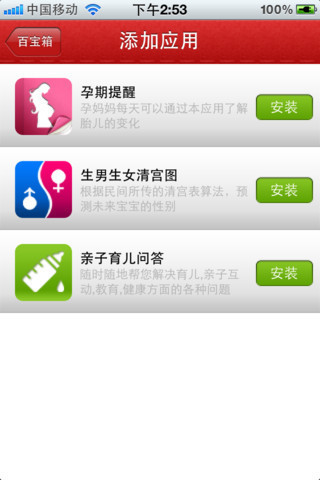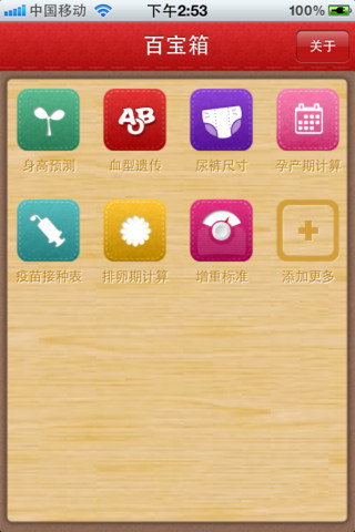 妈妈百宝箱包括了生男生女预测、最佳怀孕月份、宝宝血型查询、预产期自测、宝宝身高预测、安全期自测、宝宝免疫接种、孕妈妈要知道、孕期产检表等实用常用工具。家有女性,请用妈妈百宝箱!