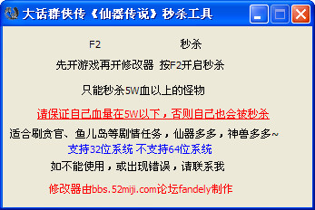 大话群侠传仙器传说修改器需要先开启游戏再开启修改器才能生效,生效后,游戏中按F2可以秒杀5W血量以上的怪物