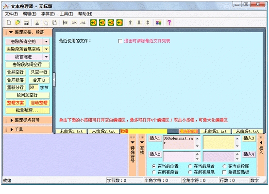文本整理器 V3.0 简体中文绿色免费版 文本整理器是一款针对中文文章格式而设计的文本编辑软件。对一篇格式不规范的文章,只需点击几个按钮,就可把它整理成规范格式。它提供了大量实用的整理工具,可满足各种不同的整理要求,使你从繁琐的修改工作中摆脱出来。它提供的批量整理功能,可以使你在几分钟内整理上百篇文本,再不用为手上的大量不规范的文本发愁了