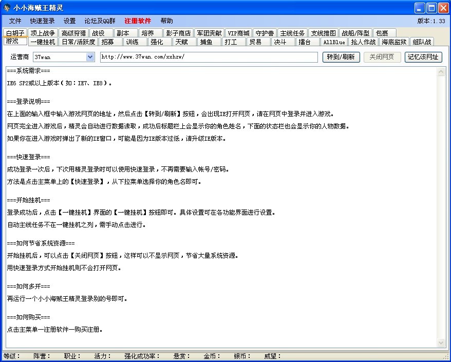 2.登录说明,在上面的输入框中输入游戏网页的地址,然后点击【转到/刷新】按钮,会出现IE打开网页,请在网页中登录并进入游戏。网页完全进入游戏后,精灵会自动进行数据读取,成功后标题栏上会显示你的角色姓名,下面的状态栏也会显示你的人物数据。如果你在进入游戏时弹出了新的IE窗口,可能是因为IE版本过低,请升级IE版本。