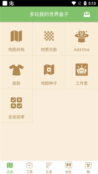 2、在“资源”平台,我们能够看到包含“地图存档”“材质光影”“皮肤”等各类资源。