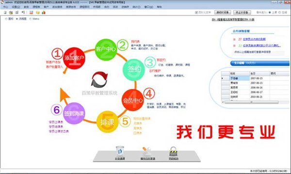 系统区别与市面上其他 B/S 模式管理软件(网页模式),百策早教管理系统的设计体系更注重与业务流程和业务事务处理方面(课时表、排课处理、刷卡上课、充值消费、积分等业务模块),以最低的成本使软件和企业相结合;另外系统的数据库默认为在企业内部,充分保障了企业数据的安全性。