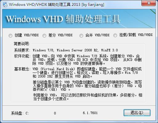 Windows VHD 辅助处理工具是一个用于创建、安装、维护 VHD 的辅助工具,把一个比较复杂的操作过程傻瓜化,使您轻松体验 VHD 的强大功能。包括: 创建 VHD、向 VHD 中安装 Windows 7 系统,创建差分 VHD,合并 VHD,挂载、分离 VHD,向 BCD 中添加 VHD 项目, 从BCD 中删除 VHD 项目,以及差分 VHD 的快速替换等。内置 ImageX.exe 和 Ghost32.exe,支持把 WIM 或者 GHO 系统装入 VHD。