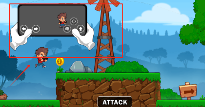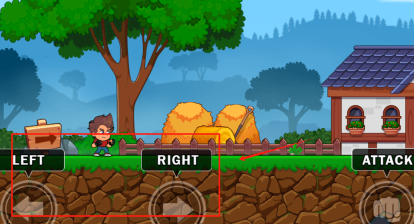 3画面里,一个小男孩正跑动着,身侧散落着可以拾取的金币。界面下方设有一个写着“ATTACK”的按钮,上方的红色方框区域则呈现出虚拟手柄的布局,其中包含方向控制键与攻击按键,用来操纵小男孩的各种动作。