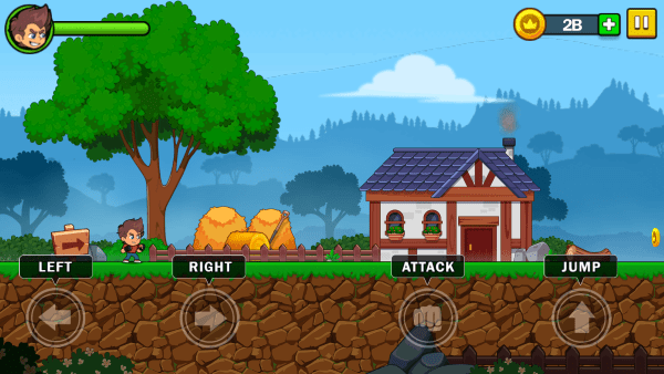 2在一片草地上,有个小男孩站着。他左边的木牌上有方向指引,右边的两堆干草可以进行互动操作。屏幕下方用红框标出了LEFTRIGHTATTACK这几个按键,它们分别用来控制移动和攻击动作。