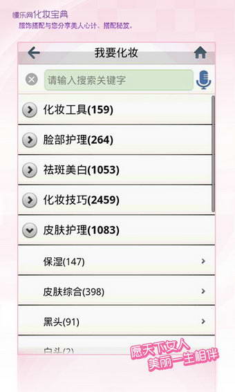 1.化妆信息实用全面,上万条化妆技巧等您查询,解决您妆容方面的任何需求。2.六大分类一应俱全:化妆技巧、彩妆达人、发型设计、香氛世界、皮肤护理、化妆工具