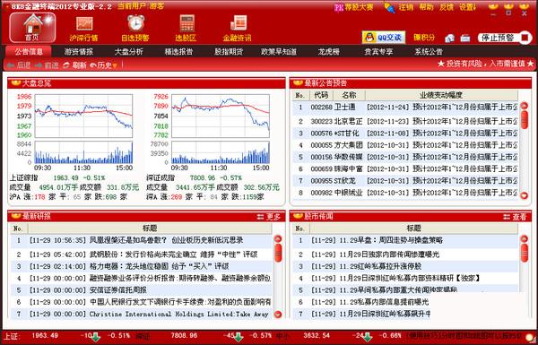 8K8金融终端2012专业版是一款专为上班族量身打造的桌面盯盘软件,不仅盯盘,更有红绿灯BS买卖点和每日精选股票池,游资情报,大盘分析,股指期货,个股预警,个股F10,机构研报,资金流向(实时)一个都不少,而且体积小巧,界面清爽,让您边工作边盯盘,上班投资两不误。