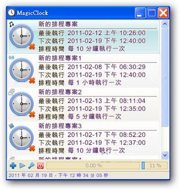 (MagicClock)是一套非常简单的时间排程软体,您可以指定每个时间执行的动作,例入“执行程式、播放音乐或电台收听...等等”,时间一到就会立即执行,时间的设定可以从每几分钟执行或者每天执行都可自由设定,当成早上起床的音乐闹钟再适合不过了,软体完全免费,设定简单方便,不失为一个好的定时工具程式。MagicClock 提供的相关功能