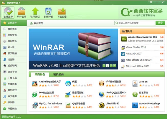设置完成,就能利用它直接从“西西软件园”寻找软件了。搜寻软件时,可通过单击“西西软件盒”界面上方的“软件推荐”、“软件仓库”和“电脑游戏”三个按钮,进入相应的界面完成。“软件推荐”提供了各类别中最热门的软件,“软件仓库”则收集了网站的所有软件,“电脑游戏”就更直观了,想找游戏,非它莫属。
