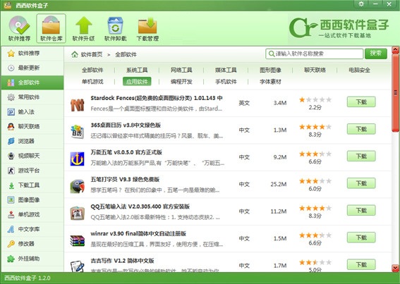 西西软件盒官方版是由西西软件园打造的一款集 下载、更新、卸载 为一体的软件管理工具,提供的类型涵盖系统安全,杀毒,聊天工具,图形处理,视频观看,硬件驱动,单机游戏,手机工具,编程开发,电子教程等各方各面,用户不需要登录任何网页就可以获取到软件的最新的版本、第一时间就可以订阅到您所喜欢的软件,一键式下载可以让你更方便更轻松的安装软件。