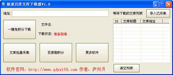 极速百度文库批量下载器 v1.0 绿色破解版 极速百度文库批量下载器是一款百度文库下载器破解版软件,支持按关键词采集百度文库中所有文档,支持批量导入已采集到的文档下载地址,有了该下载器您可以一键批量免积分下载操作,还增加了百度刷积分功能,是一个功能强大,体积小巧,简单实用的百度文库下载器!