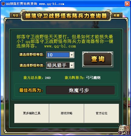 QQ部落打野布阵查询工具是一款简单,免费的QQ部落守卫战打野布阵查询器,可以使你的兵力克制野怪,损兵数大大减少!