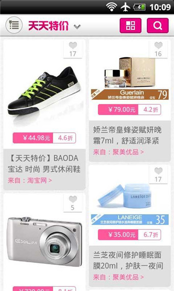 1. 包括京东、凡客、当当、库巴、乐蜂网、薇薇安、梦芭莎、玛萨玛索、悠品网等数十家信得过的电子商务网站的限时促销宝贝;2. 汇集淘宝网天天特价、聚划算频道最新最全的优质折扣商品;