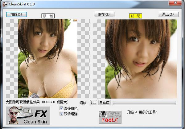 图片美化小软件(CleanSkinFX) 1.0绿色中文版 图片美化小软件CleanSkinFX是一个将图片自动美化的小软件,提供原始图和结果图的对比,优化后的图片,效果比原来更加靓丽,具有增强粉色,和双倍增强的功能。