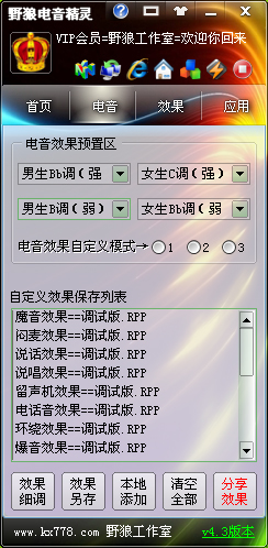 电音精灵目前分为(用户体验版) (VIP客户专用版) (网络共享版) (定制效果版)这4个版本,来达到不同客户的不同需求!
