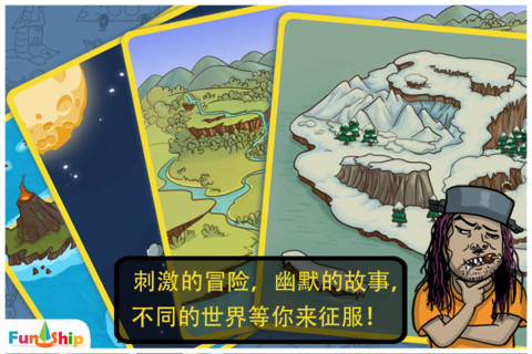 -故事冒险模式:四个不同的世界进行冒险,体验不同的幽默故事,完成不同任务,世界的尽头还有牛X的Boss等着你去挑战。还能升级角色,赢得各类奖励,“吊丝”也能变“高富帅”