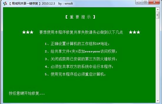 win7局域网共享一键修复工具 win7局域网共享一键修复工具可一键解决局域网计算机、打印机各种共享失败的问题。同时还可以修复网上邻居、工作组无法浏览和使用的情况,使用工具后必须重启计算机,否则修复可能无效。制作初期尚有不足之处还望谅解,使用中遇到的问题请及时跟帖回复,以便后续版本改进。软件已经过小红伞检查,请放心使用。目前正在搜集常见的win7和winxp互访问题的症状,测试完善后将会在近期加入此功能。本工具兼容主流的Windows系统,对XP、Vista、Win7都有很好的修复效果。