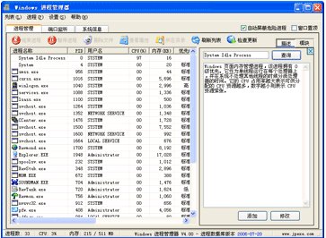 本软件最大的特点在于它丰富强大的进程信息数据库,包含了几乎全部的Windows系统进程,和大量的常用软件进程,以及不少的病毒和木马进程。并且按其安全等级进行了区分:正常进程(正常的系统或应用程序进程,安全)——黑色;可疑进程(容易被病毒或木马利用的正常进程,需要留心)——绿色;病毒&木马进程(危险)——红色。可以让您在查询进程时一目了然地分辨出进程是否安全。另外本软件提供查看进程文件路径的功能,您也可以根据进程的实际路径来判断它是否为正常进程。最后,您还可以使用软件提供的“删除文件”直接结束并删除危险进程。这一切对于您维护系统安全与稳定很有帮助。