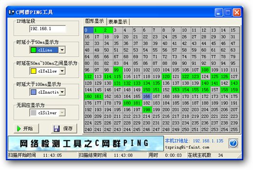 网络检测工具Cping 提供了对一个C类IP地址进行ICMP测试的功能。通过255个线程进行测试后,测试结果以四种色彩直观的显示出来,方便判断。