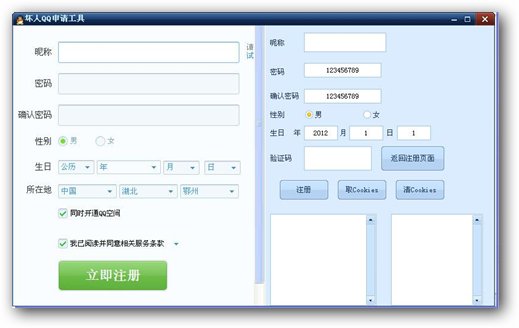坏人QQ申请器2012 v2.0 最新版 坏人QQ申请器是一个简单的qq申请器。该qq申请器无ip限制,操作简单,可以完美解决QQ注册限制IP的问题。如果限制了就自己换IP(可以使用VPN代理、和重新连接)在点清楚COOKies。坏人QQ申请器最新版绝对没毒。