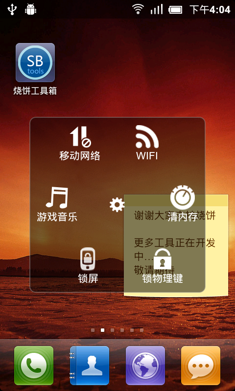 烧饼工具箱(SBtools)是首款支持一键锁定物理按键(返回键,菜单键,home键,搜索键)的Android工具箱,由国内个人开发者烧饼倾情奉献。具有绿色免费,无广告,小巧精致,简单实用,可扩展性强,无需root权限等优点!