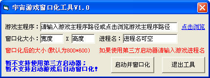 宇宙游戏窗口化工具使用D3D在指定游戏启动前执行窗口化,对游戏无影响、操作简单,选择游戏路径即可启动窗口化。支持大部分游戏。 宇宙游戏窗口化工具 v1.0更新: 程序加壳压缩,减少误报几率。