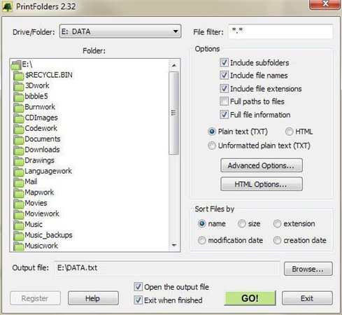 PrintFolders可以将文件及文件夹列表打印成一个简单清楚的文件。它的主要功能包括:列出所有目录树,指定或拒绝相应文件,按名称,扩展名,大小或日期排列文件。