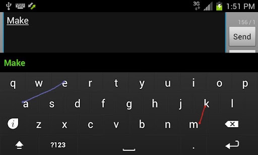 《划屏输入法Keymonk Keyboard》的输入法采用了完全类似Swype的文字输入方式,但是不同的是支持双手输入。只需要按住屏幕,不间断地连接字母,你所想要的单词就会出现!这款输入法,确实不同于以往的方法,新颖易用。至于速度与适应性的问题,因人而异~最重要的卖点在于双手滑动操作。从双手滑动操作来看乐趣性十足!