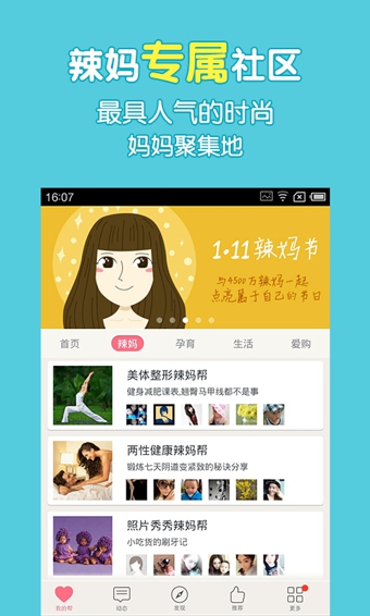 1、宝宝年龄‘帮’:按照宝宝年龄对应的帮,如孕早期辣妈帮、1个月宝宝辣妈帮、1-2岁辣妈帮、幼儿园宝宝辣妈帮等,选择适合自己宝宝年龄的帮加入,与宝宝同龄的辣妈们交流育儿经验。2、热门话题‘帮’:宝宝营养、健康、教育、美食、购物、亲子游、趣事等等,最贴近妈妈需求的热门话题一网打尽,在这里一起分享交流妈妈最关注的热门话题。